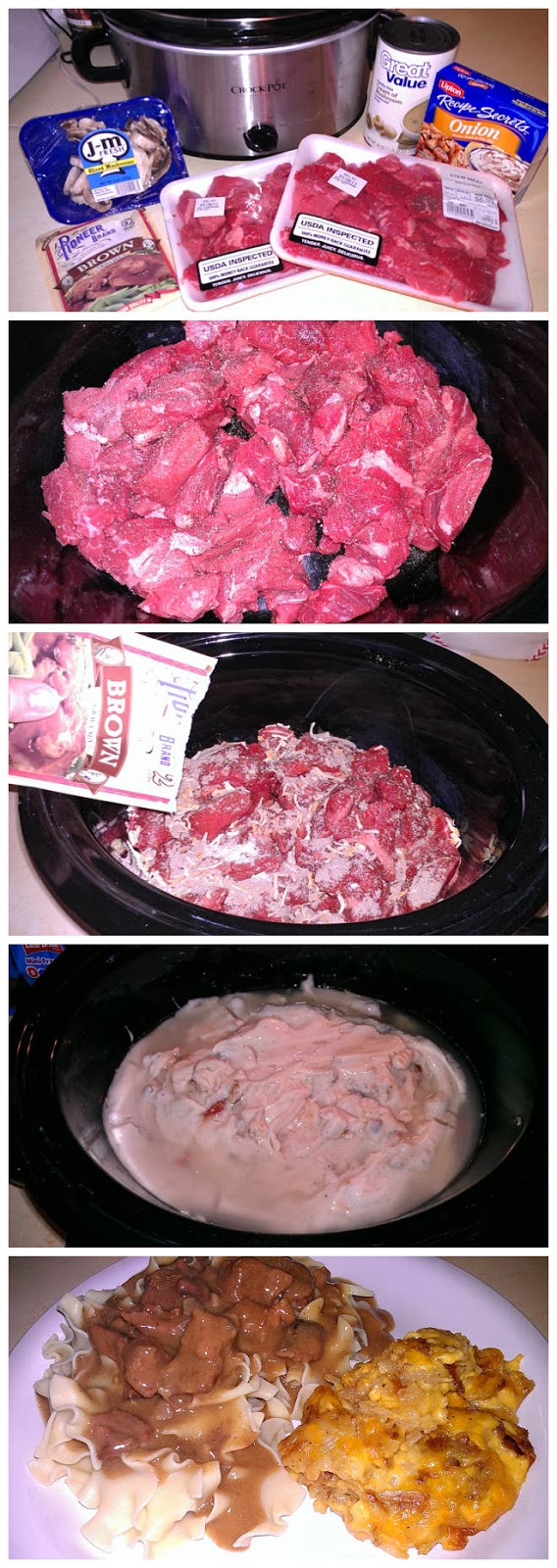 Beef Tips & Gravy…I used mushroom soup with roasted garlic and a half cup of fresh mushrooms. Had that classic Mom’s comfort food taste. My husband loved it and it was so easy and inexpensive. Making this one again for sure!