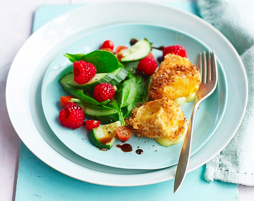 ½ camembert cheese, 1 egg, beaten, 2 tbsp fine desiccated coconut, olive oil for frying, 30g baby spinach, 5 cherry tomatoes, 10 slices cucumber, 40g berries of your choice, balsamic vinegar, to serve