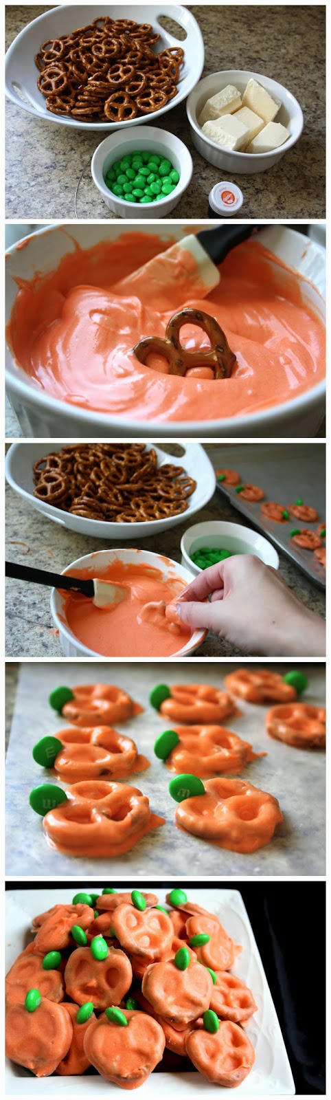 Pumpkin pretzels–use white choc. chips with orange food coloring and green M’s. Great tip on the blog–use shortening to keep the white choc. from getting clumpy and too thick. Enjoy kids!