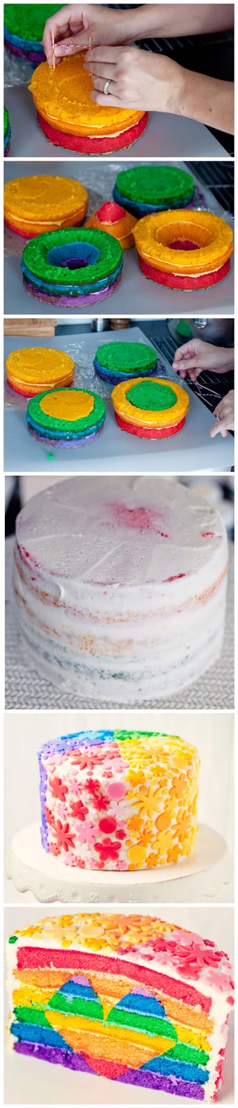 Rainbow-Heart-Cake-Slice Super easy really, just take white cake mix dividing it into smaller bowls and add whatever colors of food dye you want then pour into the cake pan. My sister loved it and I even made rainbow frosting for the top of the cake too