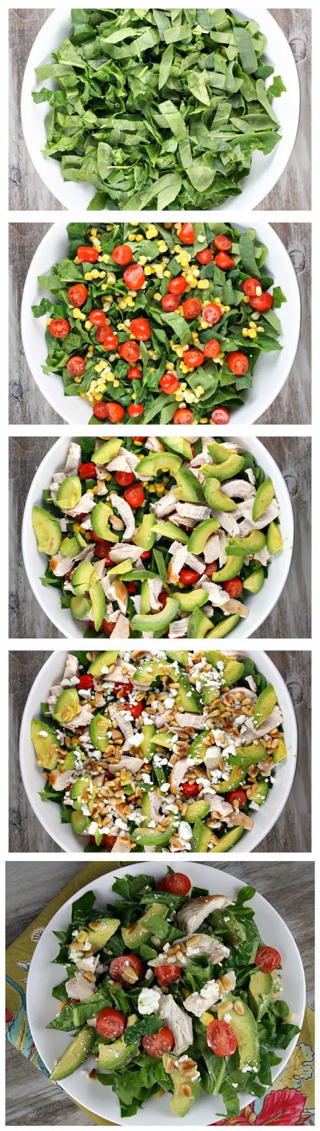 spinach salad with chicken, avocado and goat cheese
